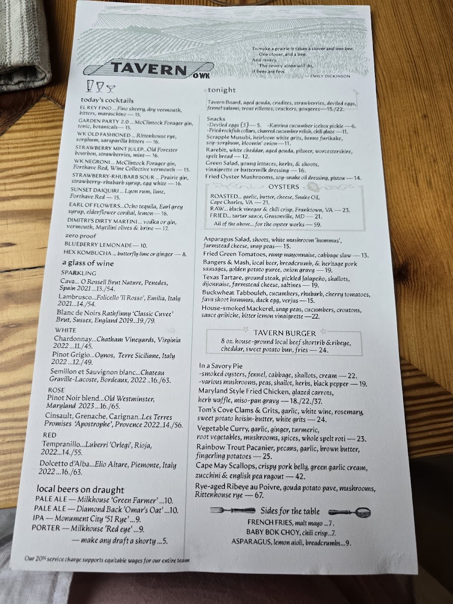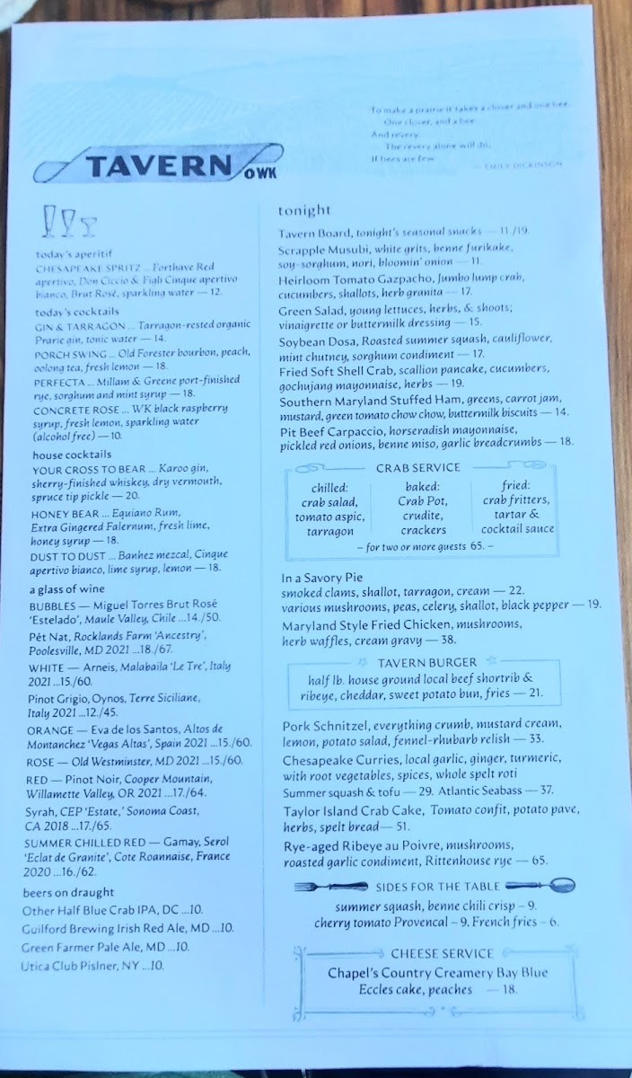 The Tavern at Woodberry Kitchen offers a thoughtfully curated menu that blends comforting American classics with a touch of seasonal freshness. The selection is approachable yet refined, perfect for enjoying casual lunches, relaxed dinners, or weekend brunches in a welcoming setting.