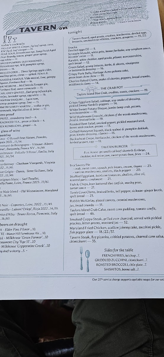 Expect simple, satisfying dishes like the Tavern Burger & Fries or the Country Ham Flatbread alongside standout delights such as fresh Raw Oysters and the Tilghman Island Crab Pot. Small plates like Deviled Eggs and Crab Dip invite sharing, making it easy to savor a variety of flavors as conversations unfold.
